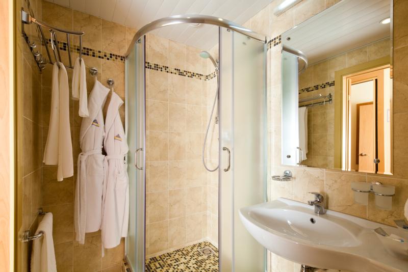 Ванная комната в номере первого класса гостиницы «Бета» оборудована большим зеркалом с подсветкой, настенным феном, ванной с душем и прочим импортным сантехническим оснащением.